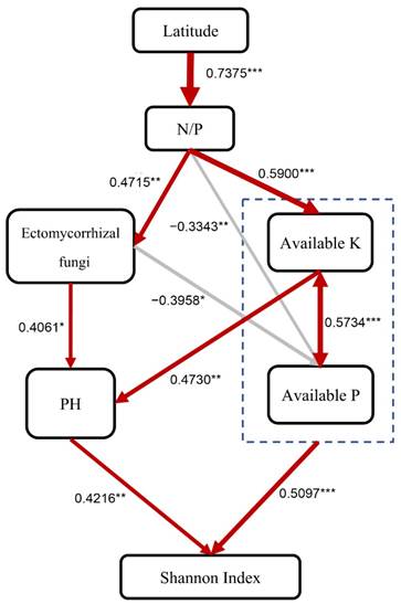 图 3. 描述驱动因素对中国森林土壤真菌OTU Shannon指数影响的结构方程模型(SEM).箭头旁边的数字表示关系的效果大小。红色表示正相关,灰色表示负相关。* p < 0.05, ** p < 0.01, *** p < 0.001.