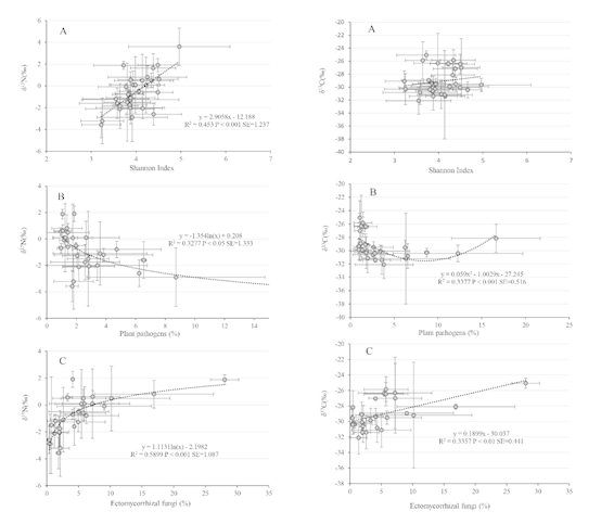图2. 叶片δ15N和δ13C与土壤真菌多样性、外生菌根和植物病原丰度的关系