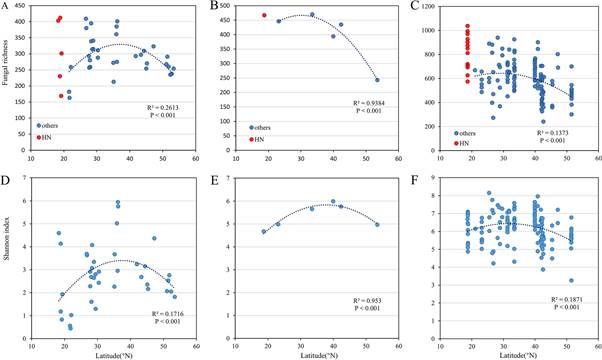 图4. 纬度与土壤真菌丰富度的关系。基于参考文献3(A)、5(B)和4(C)的数据。HN是指海南岛的样本。纬度与土壤真菌香农指数的关系。基于参考文献3(D)、5(E)和4(F)的数据。
