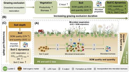 来自植物根际和凋落物层淋溶的易分解外源碳(LOC)输入土壤是生态系统常见的自然现象,其在微生物介导的土壤碳循环中发挥着关键作用,尤其是在植物根系密集的草原生态系统。然而,外源碳的输入并不总是意味着土壤碳的净增加,因其能为异养微生物群落提供可用的碳和能量,进一步对土壤有机质的分解产生影响,即激发效应(Priming Effect,PE)。长期以来,尽管许多研究已经探讨了由外源碳添加诱导的激发效应,但很少有研究关注其短期效应。其次,输入土壤的外源碳是高度动态变化的,会迅速融入微生物、土壤有机质,或分解为CO2,但由于土壤微生物对外源碳输入的反应很快,来自外源碳的呼吸作用对微生物呼吸作用的相对贡献及其影响因素仍不确定。此外,围栏禁牧被认为是实现草地生态系统自我恢复的重要途径,其对土壤碳氮特性具有重要的积极影响,而围栏禁牧所导致的土壤碳氮特征变化可能进一步影响微生物对外源碳和土壤有机质的分解,但目前仍然缺乏对此的全面了解。