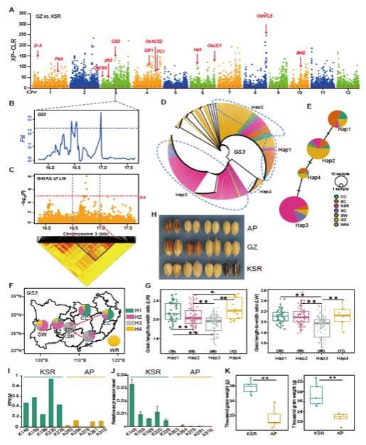 基因组印记揭示香禾糯农艺性状相关的关键基因GS3、Hd1和DPS1以及耐冷相关的关键基因LTG1和MYBS3是侗族驯化的目标基因(图2A、B、C),其单倍型变化模式为香禾糯驯化动态过程提供了遗传证据(图2D、E、F、G)。如与祖先群体相比香禾糯的籽粒更圆润饱满、千粒重增加(图2H、2K),体现了驯化过程中侗族发挥的积极作用,其遗传背景则是GS3的精准调控与表达(图2I、J)。全基因组关联研究发掘了一个穗粒数相关新基因,RNA-seq和qRT-PCR表明该基因可能对水稻增产发挥重要作用。该研究将自然科学与社会科学深度融合,通过多学科交叉的方法提出了侗族族源和迁徙的历史情景,为人类文明研究提供了新的工具;同时为香禾糯的有效保护和利用提供了科学依据,对促进水稻品种改良和保障国家粮食安全具有重要意义。