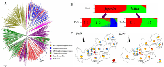 目前,有学者对香禾糯的群体内部遗传多样性进行了相关研究,但研究中试验材料相对有限,缺乏与其他地区地方稻种的比较研究。基于此,该研究团队以香禾糯、贵州省六个生态稻作区地方稻种、周边9省地方稻种及野生稻共计1481份资源为试验材料,开展了我国长江流域以南核心地方稻种的遗传多样性比较分析、群体分化与群体结构分析、基于6个非连锁核位点的中性检验分析、单倍型的系统发生关系分析及群体遗传分化分析,结果发现香禾糯遗传背景独特,是一类特殊生态型地方稻种(图3A、 B);同时研究发现香禾糯群体抗白叶枯病基因(Xa23)和抗稻瘟病基因(Pid3)的单倍型不仅丰富,而且还具有区别于其他地方稻种的特有单倍型(图3C),再次说明香禾糯群体是一类特殊、优异的水稻种质资源。该研究为水稻地方品种的改良和利用提供了重要信息。