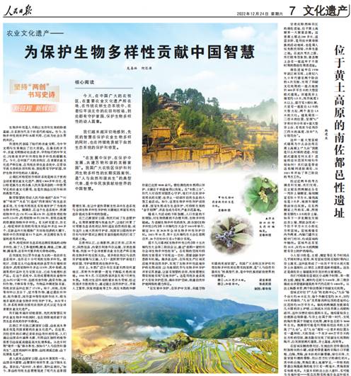 2022年11月8日,《中国青年报》第10版“思想者”栏目刊登了研究生白雨同学和龙春林教授署名的题为“重要农业文化遗产地的生物多样性应受到保护”一文,聚焦农业文化遗产地的生物多样性,提出在实践中要基于“人与自然和谐共生”的思想,兼顾“活态”传承,因地制宜地推进生物多样性的有效保护和生物资源的合理利用,确保农业生态系统的安全和可持续发展。