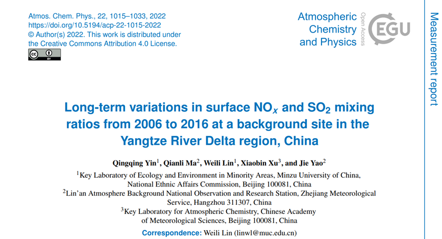 长期、准确的背景大气成分观测是认识区域污染根源的基础性工作,也是研究和评估污染控制措施有效性的科学依据。近来,林伟立研究员团队在NOx和SO2两类污染气体的长期监测研究上取得重要进展,研究成果以“Long-term variations in surface NOx and SO2mixing ratios from 2006 to 2016 at a background site in the Yangtze River Delta region, China”为题发表在Atmospheric Chemistry and Physics(地球科学1区)上,文章链接//doi.org/10.5194/acp-22-1015-2022。