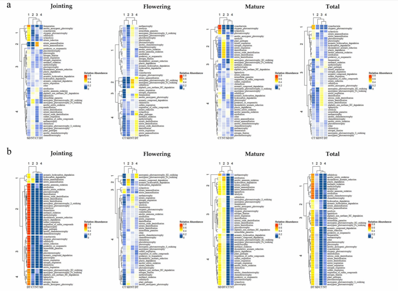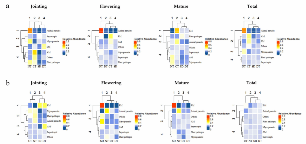 图4. 不同秸秆还田方式及生长阶段下内生与根基真菌功能群落的相对丰度。