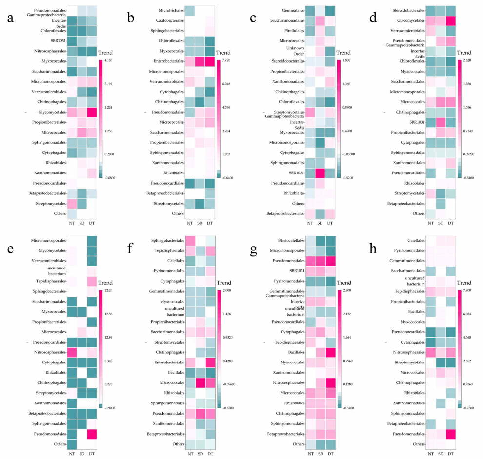 a-d分别展示了内生细菌相对丰度的变化情况。a为在拔节阶段的丰度,b为开花阶段,c为成熟阶段,d为所有阶段。e至h分别表示根际细菌在拔节阶段的相对丰度变化。e表示拔节阶段,f为开花阶段,g为成熟阶段,h为所有阶段。前20个细菌目按相对丰度排序。CT:传统;NT:免耕;SD:错位轮还;DT:深耕