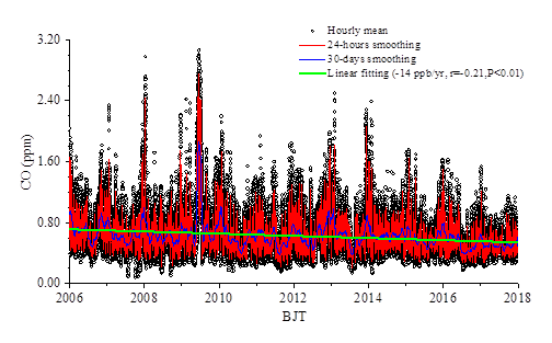图1.临安大气本底站CO浓度时间序列变化