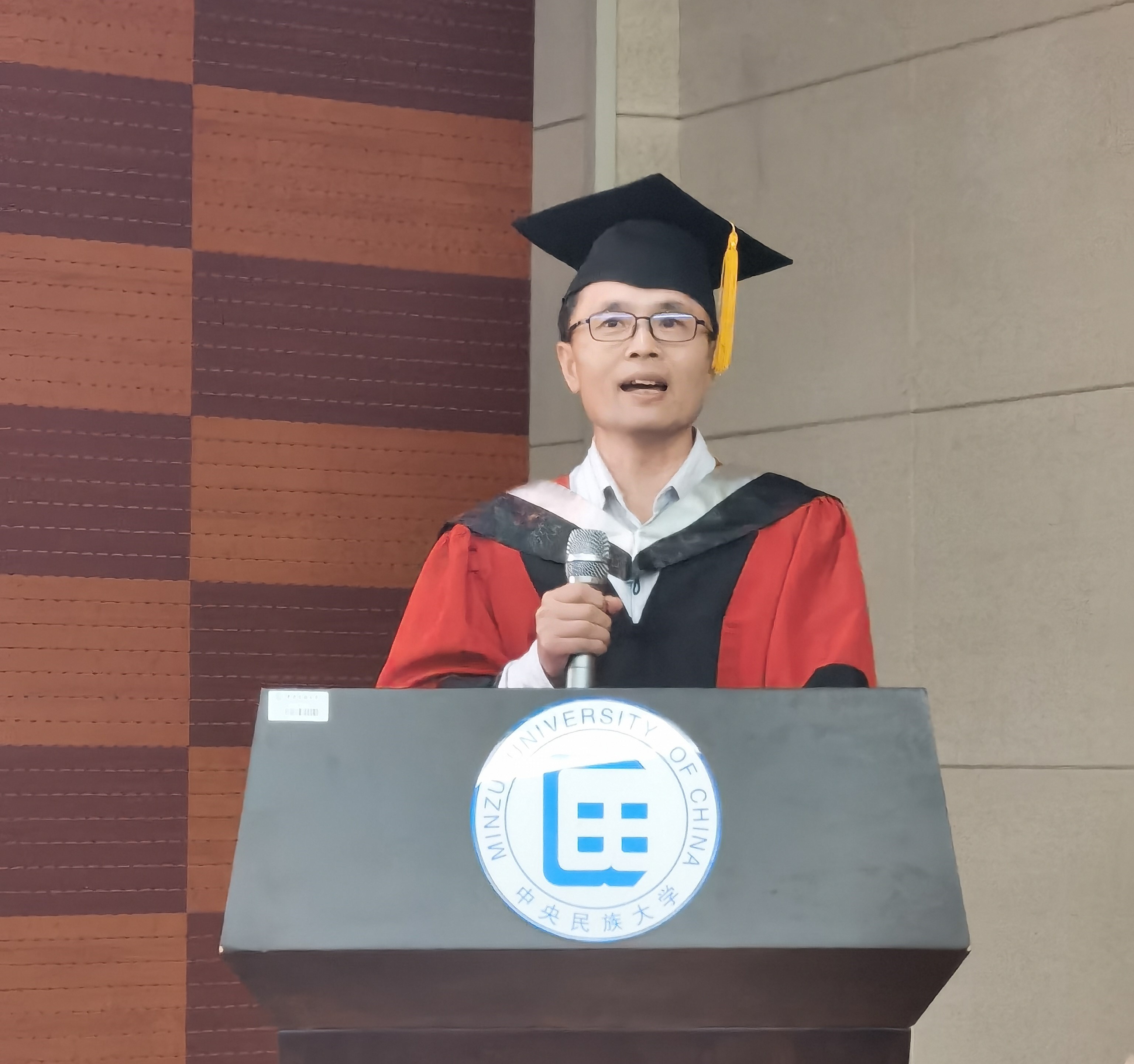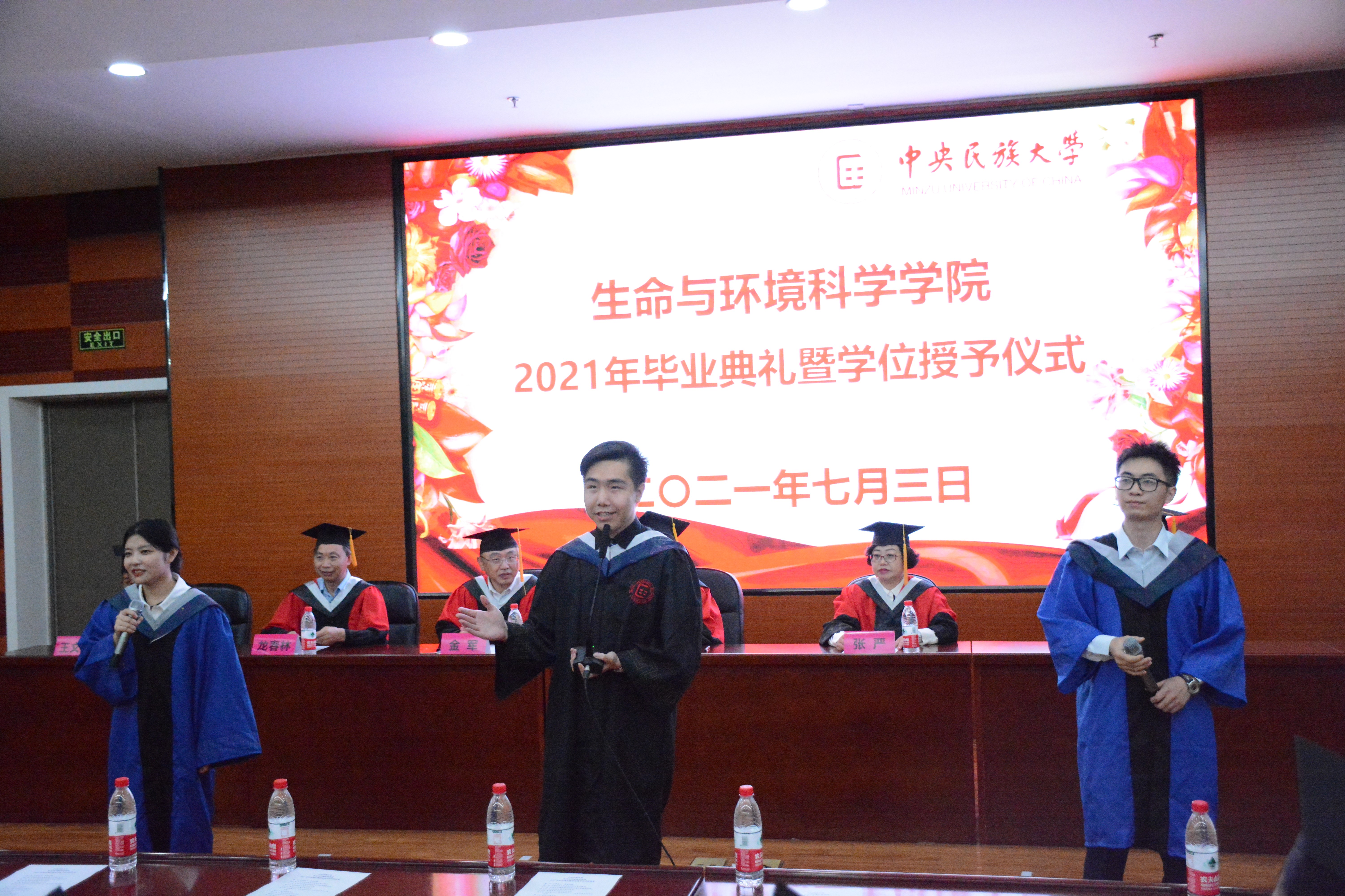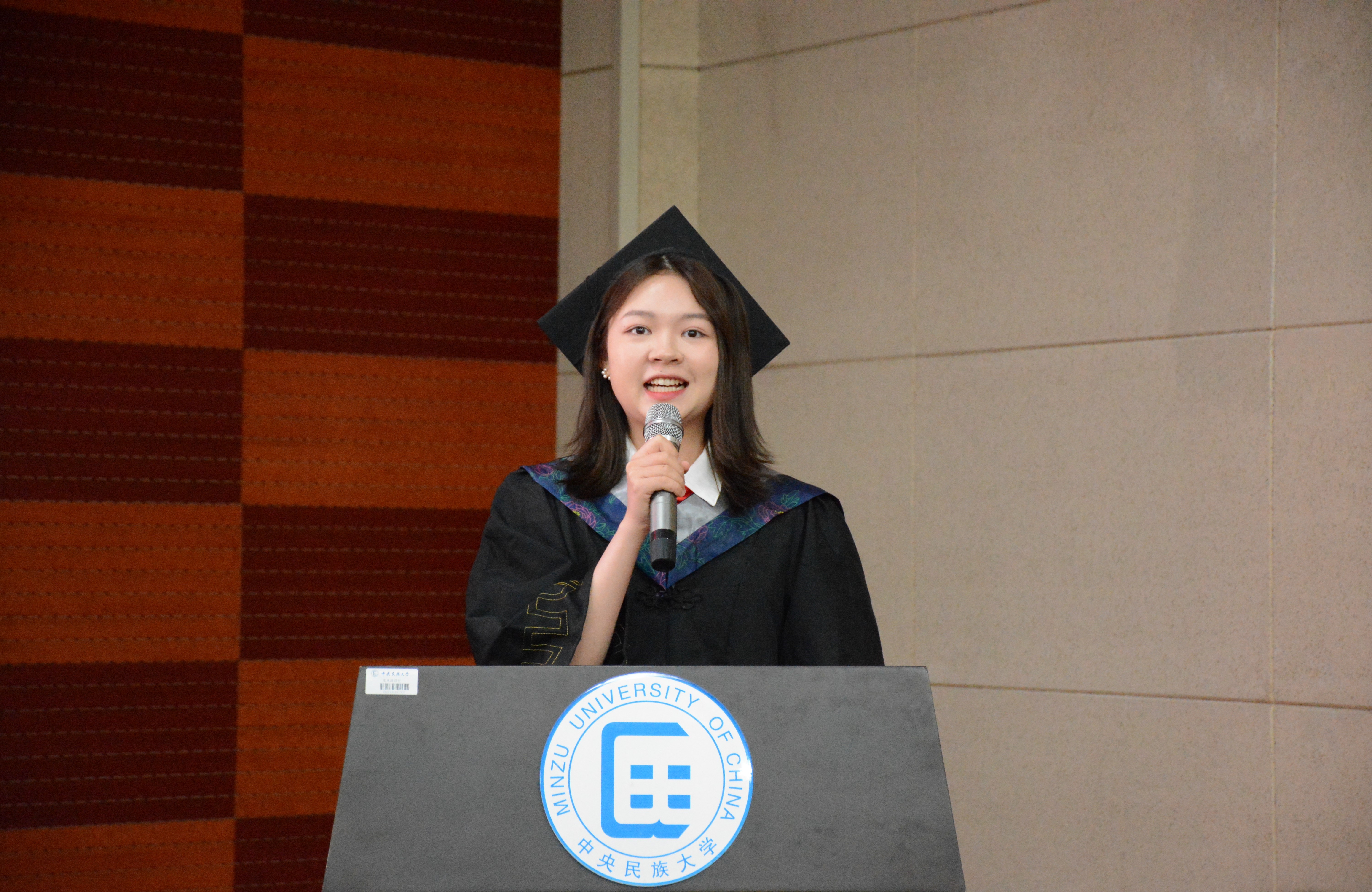 本科生毕业生代表赵悦汝同学及研究生毕业生代表程卓同学分别发言。他们向关爱学子、诲人不倦,给予殷切教导的师长表达出衷心的感激之情;回顾了校园生活的点点滴滴,讲述了各自在民大、在生环学院几年来的成长历程。寥寥数语,饱含着经自身实践而得到的颇多感悟,亦不乏对校门外生活的憧憬与向往。最后,两位毕业生代表向全体毕业生送上了诚挚的祝福,“愿大家佩戴着民大生环人的标签,奔赴五湖四海,绽放绚丽之花” “带着美美与共、知行合一的校训,以及青春如火、超越自我的生环精神,在新的岗位,建功立业”。