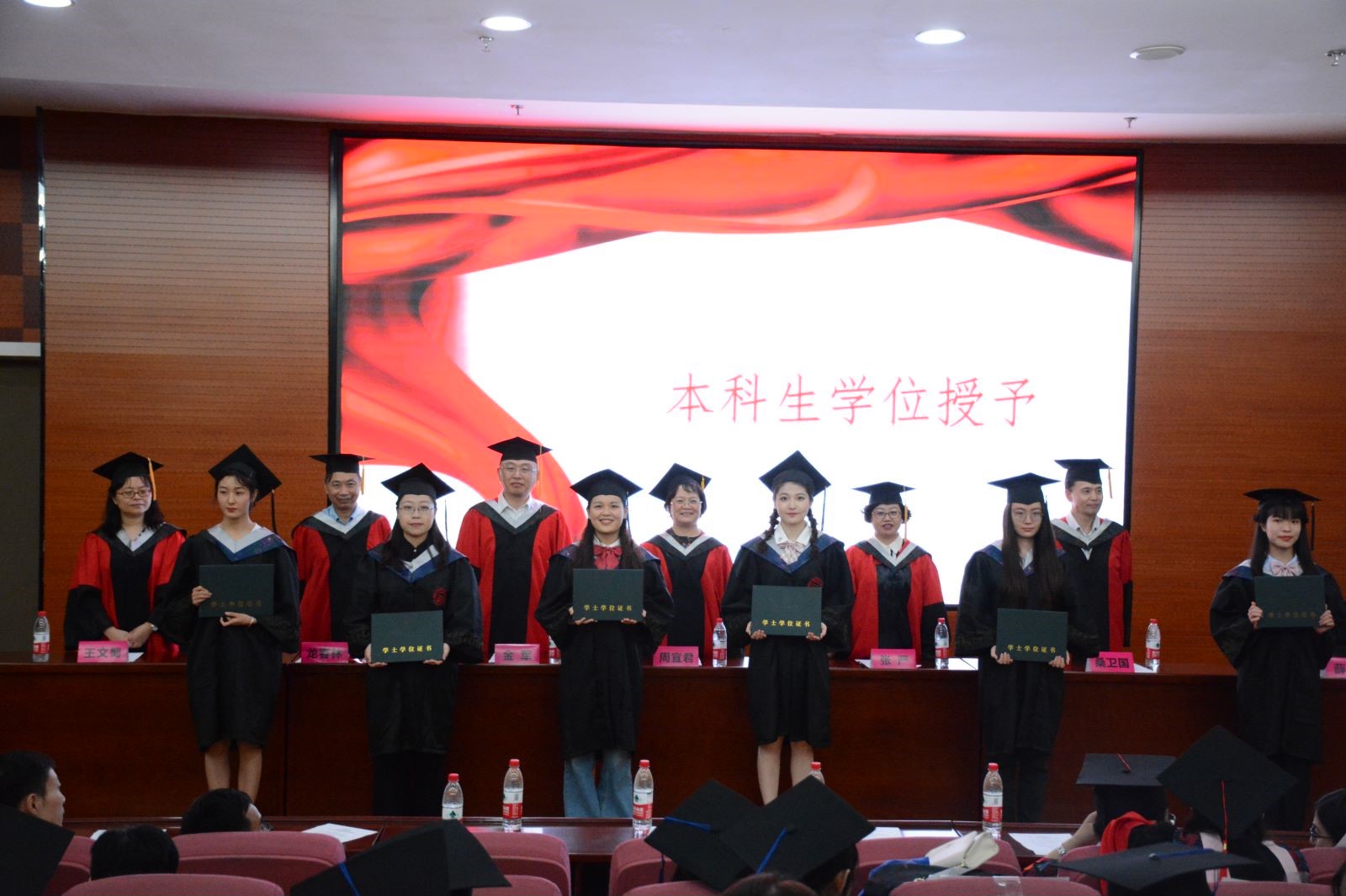 学院院长周宜君教授、学院党委书记张严教授、学院副院长金军教授、学院教授委员会委员龙春林教授、桑卫国教授与王文蜀教授为生环学院2021届全体毕业生授予学位。博士毕业生、硕士毕业生与本科毕业生,依次上台,接过学位证书,共同见证、分享彼此在“攀登舟山、横跨学海”历程中的重大时刻。