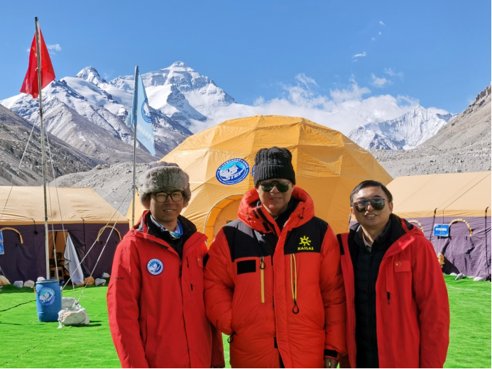 林伟立教授及其博士研究生陈熠作为第二次青藏科考“巅峰使命2022”——“珠峰大气与人体健康”科考分队的骨干成员,于2022年4月25日到达珠穆朗玛峰北坡登山大本营(海拔5200米),与北京大学(2人)、中科院合肥物质科学研究院(1人)等科考人员一起,在大本营建立观测营地。通过两天多的艰苦努力,克服高寒缺氧、大风降雪等不利环境因素,率先开始大气化学成分(臭氧O3、NOx)、水汽/二氧化碳和臭氧通量、三维风廓线、光解速率常数、气溶胶的吸收与散射等的观测,并获得了首批在线观测数据。4月28日央视新闻频道在 “巅峰使命2022”珠峰科考启动报道中着重报道了这一重要工作进展。