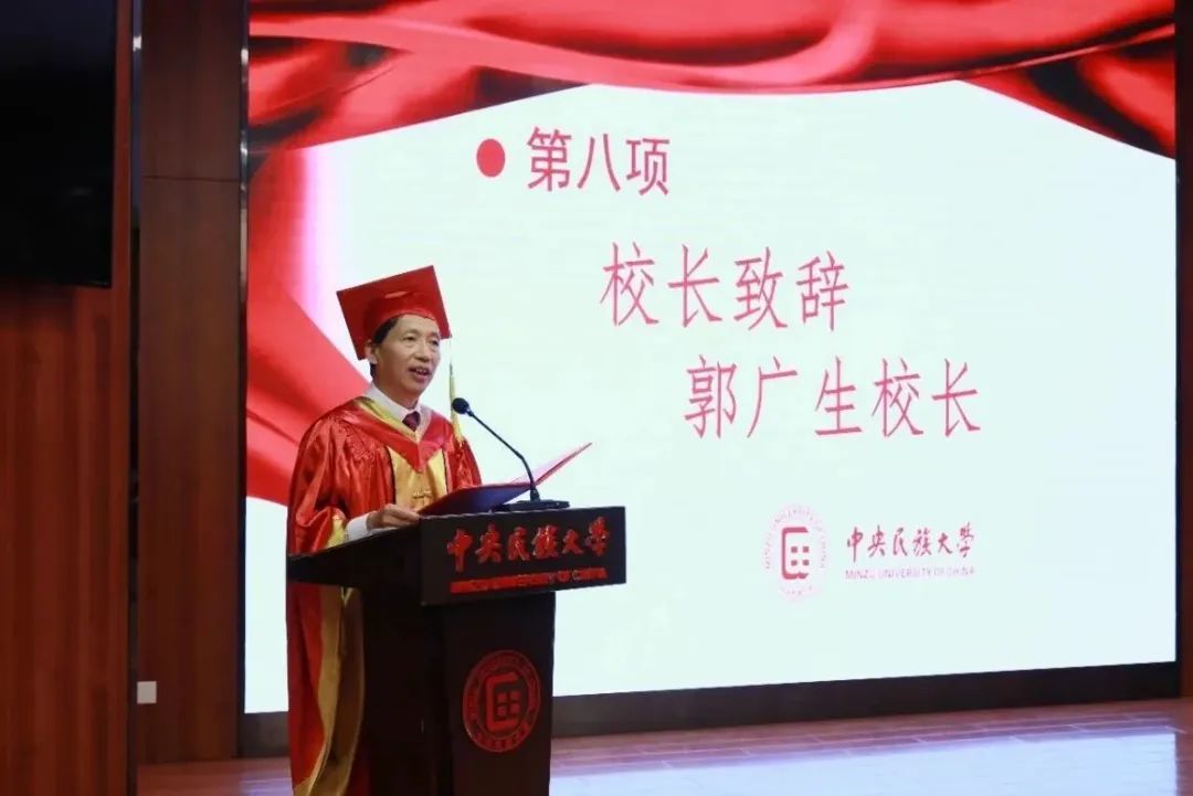 郭广生在致词中深情回顾了首届中外合作办学项目学生四年的学习历程,指出这届毕业生见证了党和国家事业发展取得的伟大成就,见证了学校事业的高质量发展,体验了中外合作办学的魅力,这些都将成为宝贵的人生财富。郭广生寄语“今年学校送走的最后一批毕业生”,一要厚植家国情怀,未来不论身处何地,都始终赓续“我从延安来”的红色血脉,把深沉的家国情怀融进火热的青春,在“请党放心、强国有我”的铮铮誓言中,实现与祖国、与时代的“双向奔赴”;二要培树全球视野,扎根中国,放眼世界,以更大的担当和胸怀,有意识地强化引领未来中国发展的本领,淬炼参与全球事务的能力,努力成为具有国际竞争力的未来时代的引领者;三要砥砺奋斗精神,励志勤学、探索真知、追求卓越,做到理想坚定、信念执着、不怕困难、勇于开拓,做到“博学、明辨、审问、慎思、笃行”,用奋斗致敬这可贵的青春与伟大的时代,让青春在奋斗中绽放绚烂之花;四要勇担中华文化传播交流使命,能够时刻谨记“美美与共,知行合一”的校训,坚定中华文化自信,向世界更好地展示中华文化、中华文明,让世界各国人民更加充分地了解和认识中华五千多年一脉相承、历久弥新的优秀文化和灿烂成就,为建设中华民族现代文明、推动中国与世界各国文明交流互鉴作出积极贡献。