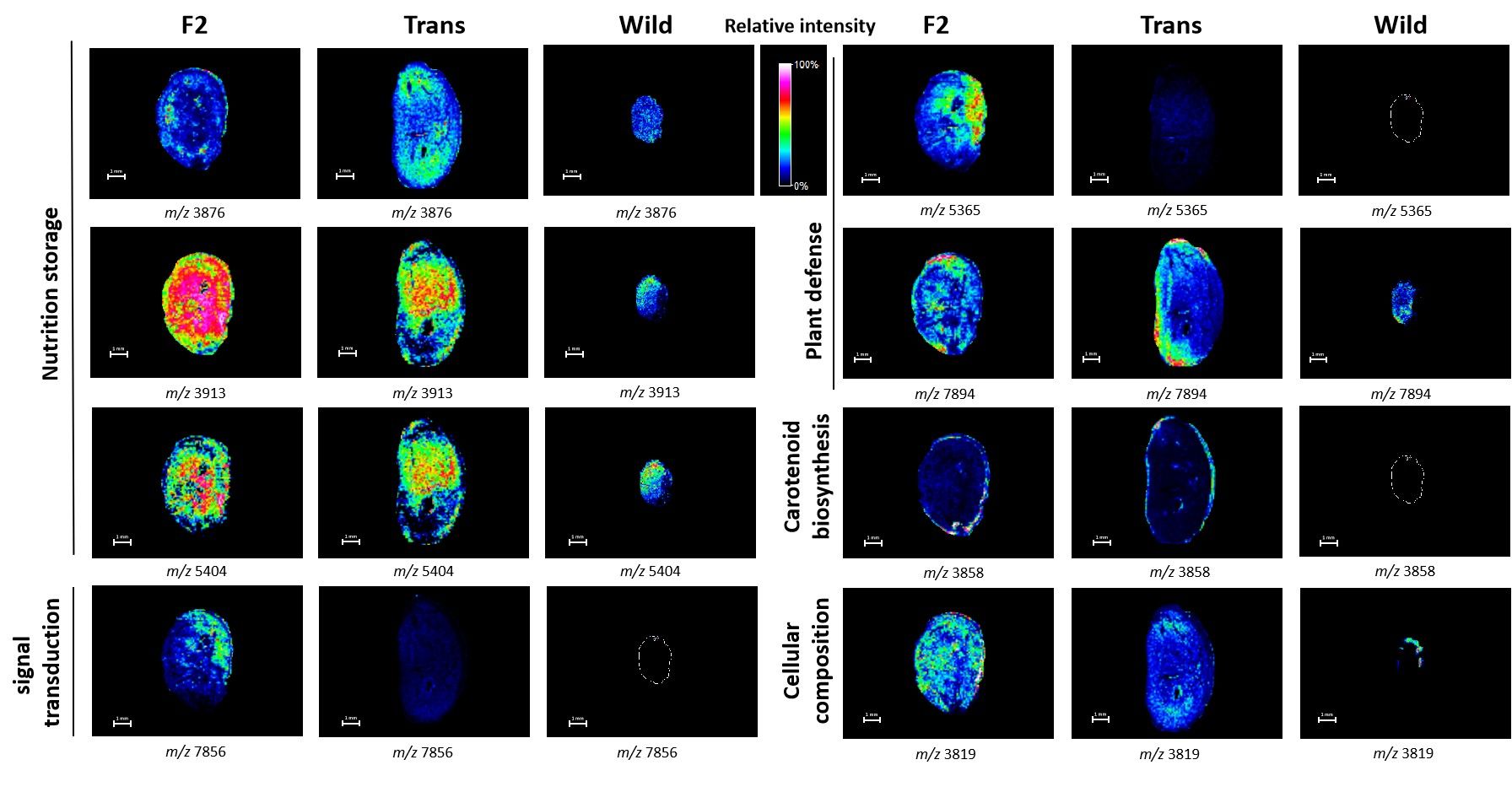 基于MALDI-MSI空间组学研究首次发现外源耐除草剂基因EPSPS和PAT的插入和表达引起大豆种子中部分内源分子分布的非预期变化。空间脂质组学研究表明,转基因大豆和非转基因大豆种子中共检测到184种脂质,其中22种脂质为转基因大豆种子特有,19种脂质为非转基因大豆种子特有,143种脂质为二者共有。经多元统计学分析显示:18种脂质在转基因和非转基因大豆种子中表达丰度和空间分布具有显著差异,这些脂质主要属于磷脂酰胆碱(PC)、磷脂酰乙醇胺(PE)、三酰甘油(TAG)和胞苷二磷酸二酰甘油(CDP-DAG)等。空间蛋白质组学研究表明,转基因与非转基因大豆蛋白质差异最小,野生大豆与其它大豆种子蛋白质差异最大;F2种子同时具有亲本的蛋白质特征。结合UPLC-Q-TOF-MS技术成功鉴定了22个显著差异表达蛋白质,其中13种差异表达蛋白质为野生大豆特有,而且在转基因大豆和F2种子中并未发现致敏蛋白质的非预期上调表达。研究表明MALDI-MSI技术是评估外源基因(EPSPS和PAT)引入而造成大豆内源性分子表达和分布差异的有效方法。该系列研究为评估转基因对植物的非预期效应提供了一种新的可视化研究方法。相信,随着MALDI-MSI技术在转基因研究领域的广泛应用将进一步有助于我们加深对转基因植物非预期效应更直观、精准理解。