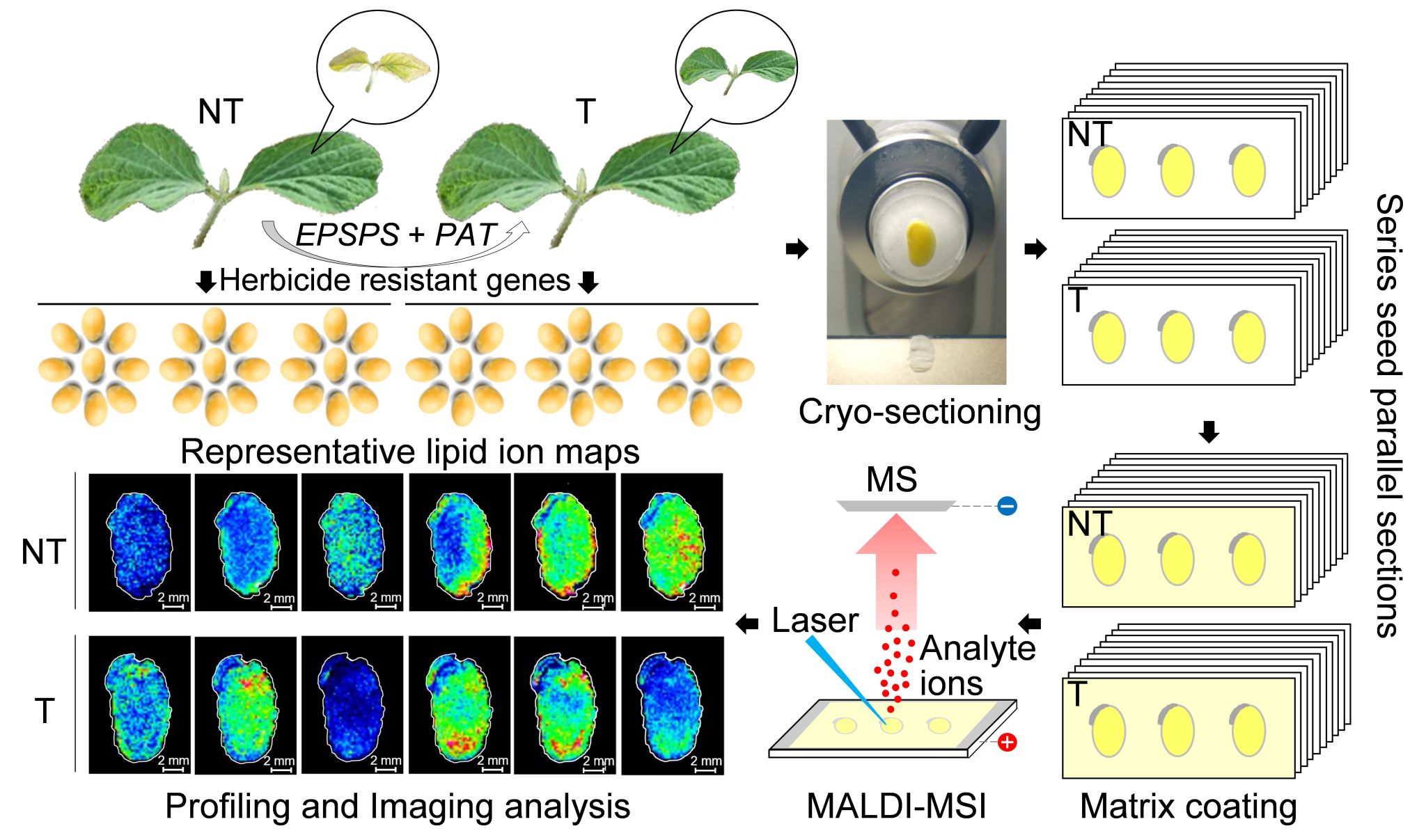 脂质和蛋白质是大豆种子的主要营养组成成分,在能量储存、信号转导和新陈代谢等生物过程中发挥多种重要作用。脂质组学和蛋白质组学分析已被用于评估转基因作物的安全性,为理解转基因相关的变化提供了必要的信息。新兴分子成像技术MALDI-MSI的应用有助于准确评估外源基因引入对脂质组和蛋白质组的影响,对于提高我们对转基因大豆非预期效应的认识开辟了新思路。