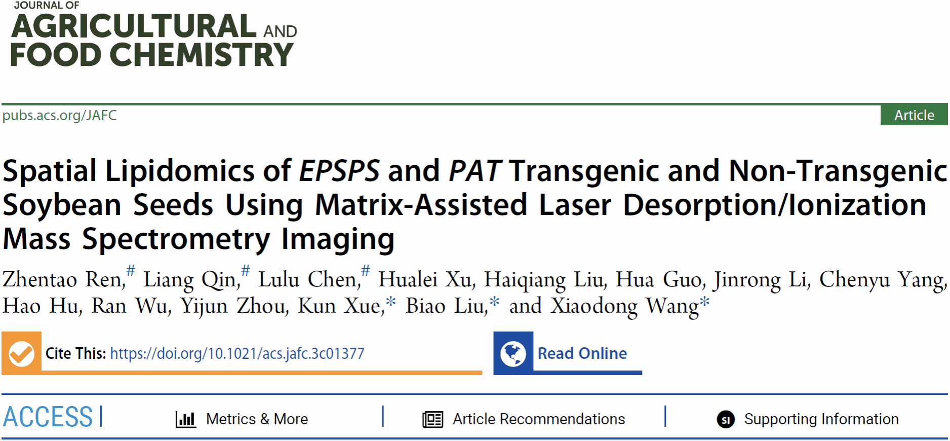 /质谱成像与代谢组学国家民委重点实验室的王晓东教授和薛堃副教授团队,在MALDI源质谱成像新应用领域方面——以MALDI-MSI技术评估转基因大豆脂质组和蛋白质组的非预期效应连续取得两项重要进展,相关研究成果以“Spatial lipidomics of EPSPS and PAT transgenic and non-transgenic soybean seeds using matrix-assisted laser desorption/ionization mass spectrometry imaging” “In situ proteomic analysis of herbicide-resistant soybean and hybrid seeds via matrix-assisted laser desorption/ionization-mass spectrometry imaging”为题,连续发表在农林科学综合权威期刊Journal of Agricultural and Food Chemistry(中国科学院一区,IF=6.1)上,其中脂质组学研究论文被遴选为期刊封面文章(Front Cover),这也是王晓东教授团队近三年来连续发表的第五篇封面论文。
