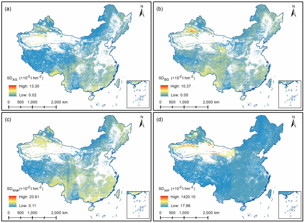 有关野外实测数据系统地估算植被和土壤中的硫储量目前报道较少。致使我们在现有的研究基础上难以真正了解陆地生态系统硫储量分布格局及其驱动因素。为此,本研究通过整合野外调查获得的实测数据和已发表的文献数据,构建了包含17618个自然群落的植被(包括叶、枝、干和根)和表层土壤(0–30 cm)硫含量和硫密度数据库(图3)。