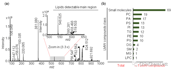 作者评估4-NC作为MALDI基质检测小鼠脑组织切片中低分子量化合物的能力,结果显示其检测的小分子和脂质分子分别在m/z 100-300和m/z 500-900范围内,并且共鉴定出52种小分子代谢物和160种脂质分子(图1)。由于4-NC基质对小鼠脑组织中低分子量化合物的强大检测性能,进一步使用其对小鼠脑组织表面多种内源性低分子量化合物进行原位成像表征。如图2所示,以4-NC为基质可以清楚显示内源性小分子和脂质分子在小鼠脑不同区域的差异分布可视化。以上结果表明4-NC基质在动物组织样品中低分子量化合物的检测和成像方面具有很大的应用潜力。