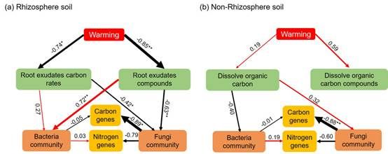 全球气候变暖对植物生产力、根系分泌物及微生物参与的地下养分周转均产生了重要的影响,因此研究增温对陆地生态系统植物-土壤-微生物之间的互作关系十分重要。2018-2021年,该团队在试验站开展了为期4年的野外增温实验(土壤5cm处增温幅度为1.1℃),探究了增温对植物根际及非根际土壤微生物的影响。研究发现,根际区增温明显降低了根系分泌物碳速率和成分的相对丰度(图1abc),降低根系真菌网络结构的复杂性及根际碳氮代谢相关基因的丰度;非根际区增温对土壤可溶性有机碳浓度和成分及土壤碳氮代谢相关基因均无显著性影响(图1def),但明显增加了非根际区土壤细菌真菌的网络结构复杂性。此外,发现真菌是主导根际和非根际土壤碳代谢相关基因的主要因素(图2)。