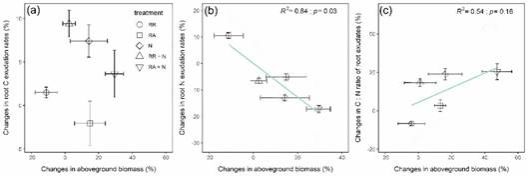 2018年该团队在试验站建立了模拟降雨量变化(对照;减雨:对照-50%;增雨:对照+50%)和氮添加(10 g N m-2 yr-1)野外试验。研究发现,降雨量和氮沉降的增加,显著增大植物根系分泌物的C:N,主要是因植物地上生物量的增大保留了更多的氮素而减少了其对地下氮分配所导致(图4b, c)。本研究结果以强有力的证据表明温带典型草原植物根系碳、氮分泌速率受降雨量和氮有效性变化的影响,证明了其碳氮化学计量特征在资源变化下的强烈可塑性。